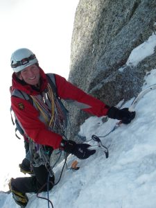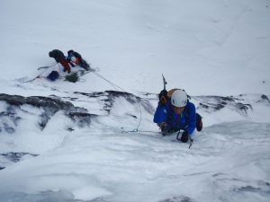 “The 2nd photo shows Dave leading Gemini, Ben Nevis, belayed by Neil Brodie and Jean-Sé Knoertzer from the ENSA, Chamonix, France. This was during a BMG Scottish winter test. Neil and Jean-Sé were observing one of our courses, and Dave had the pleasure of showing them around one of our wee Scottish cliffs, demonstrating the slick and safe ice guiding expected on our exams as well as helping with a little “entente cordiale” to strengthen relationships and knowledge between IFMGA Mountain Guide trainers.